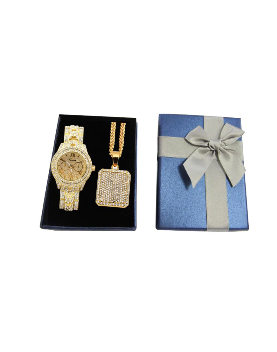 Watch & Iced Square Dog Tag Necklace Combo Set